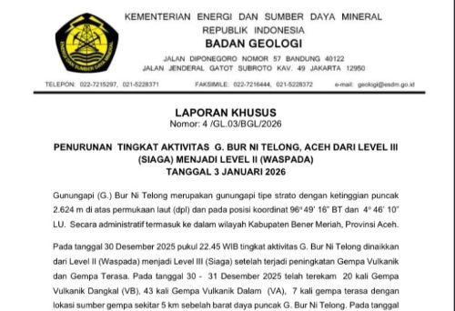 Aceh, Chanelindonesia.com – Aktivitas Gunung Bur Ni Telong di Kabupaten Bener Meriah, Aceh, resmi diturunkan dari Level III (Siaga) menjadi Level II (Waspada). Penurunan status ini mulai berlaku sejak 3 Januari 2026 pukul 14.00 WIB, setelah hasil pemantauan menunjukkan tren penurunan aktivitas kegempaan yang cukup signifikan.