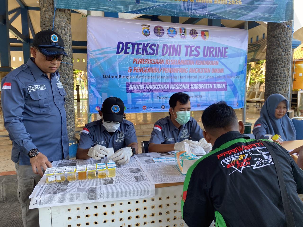 Tuban, chanelindonesia.com – Badan Narkotika Nasional Kabupaten (BNNK) Tuban bekerja sama dengan aparat gabungan dari TNI, Polri, serta Dinas Lingkungan Hidup dan Perhubungan (DLHP) Tuban menggelar razia serta tes urine bagi sopir dan kondektur kendaraan angkutan penumpang dan angkutan barang. Kegiatan berlangsung di Terminal Kambang Putih, Rabu (17/12/2025), sebagai langkah antisipasi menjelang Natal 2025 dan Tahun Baru 2026.
