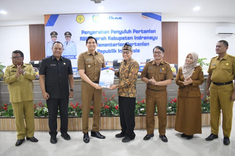 Indramayu, chanelindonesia.com – Bupati Indramayu Lucky Hakim menegaskan bahwa Penyuluh Pertanian Lapangan (PPL) memegang peran strategis dalam percepatan swasembada pangan nasional, khususnya dalam meningkatkan produktivitas dan ketahanan sektor pertanian di daerah. Hal tersebut disampaikan usai penyerahan 145 PPL ASN Kabupaten Indramayu yang terdiri dari 87 PNS dan 58 PPPK kepada Kementerian Pertanian di Aula Bappeda Litbang Kabupaten Indramayu, Selasa 16 Desember 2025.