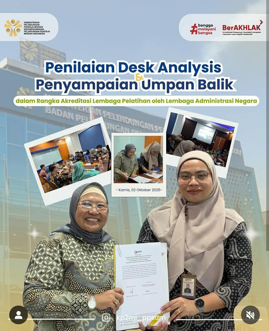 Saat ini, akreditasi PPSDM KP2MI telah memasuki tahap visitasi akreditasi atau desk analysis yang dilakukan langsung oleh asesor LAN. Tahap ini bertujuan memverifikasi data akreditasi lembaga penyelenggara pelatihan yang berada di bawah Kementerian P2MI.