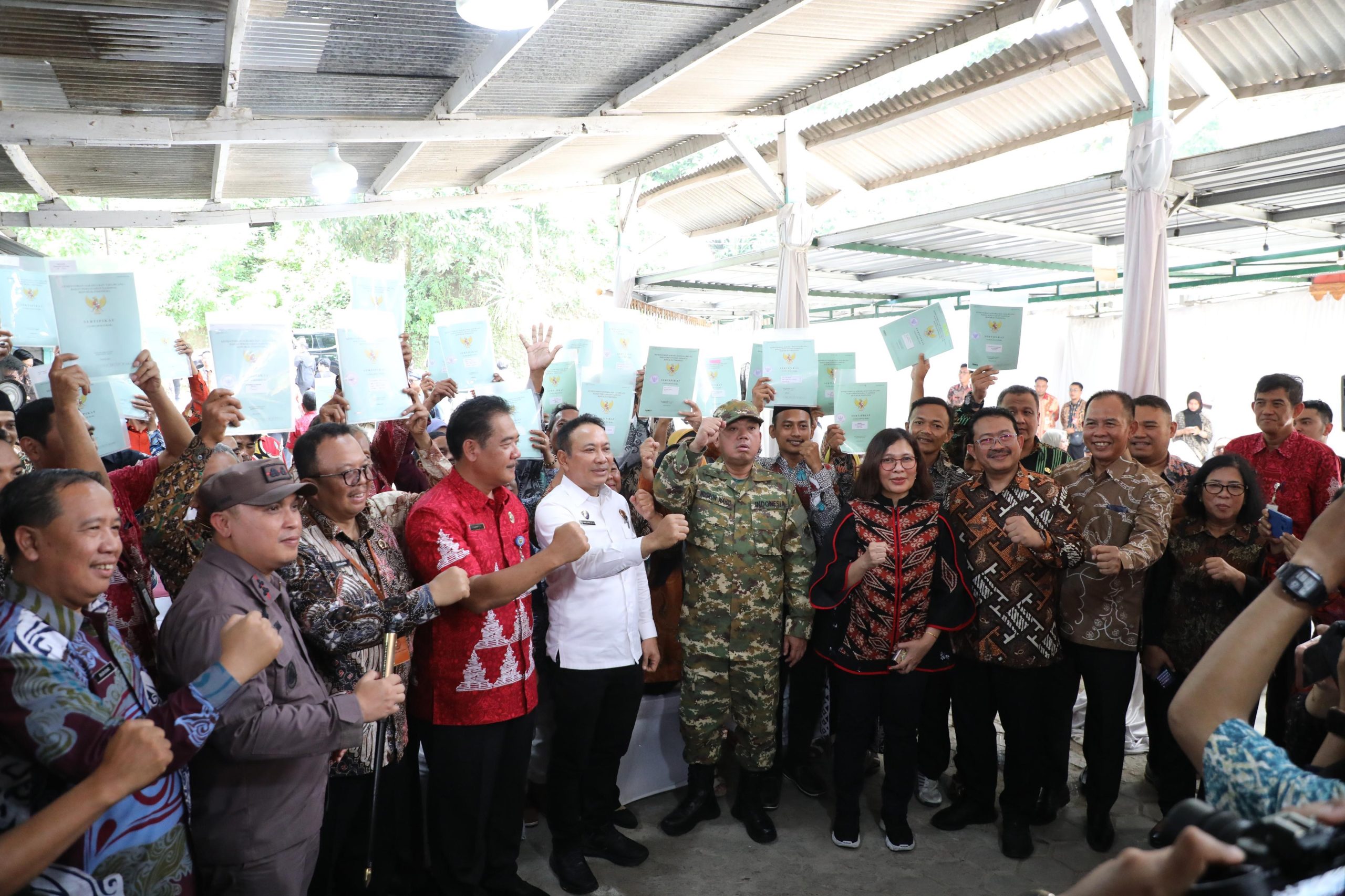 Menteri Nusron Wahid menyerahkan 965 sertifikat tanah hasil konsolidasi di Jawa Tengah dan menekankan pentingnya fungsi sosial tanah serta akses jalan bagi masyarakat. Program ini bertujuan untuk meningkatkan pemanfaatan tanah dan mendukung keadilan sosial. foto : atrbpn.go.id