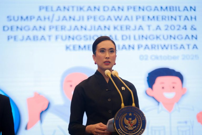Jakarta, Chanelindonesia.com – Menteri Pariwisata (Menpar) Widiyanti Putri Wardhana melantik sekaligus menyaksikan pengambilan sumpah jabatan 610 Pegawai Pemerintah dengan Perjanjian Kerja (PPPK) dan 12 Pejabat Fungsional di Balairung Soesilo Soedarman, Gedung Sapta Pesona, Jakarta, Kamis (2/10/2025).